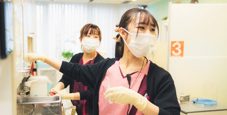 雇用・労災保険加入や厚生年金など安心して働ける制度を充実させています。産休・育休取得後に職場復帰した実績もあります。また一人ひとりの適正や希望を織り込みながら、仕事を任せていきます。楽しく衛生士業務ができる環境づくりに努めています。